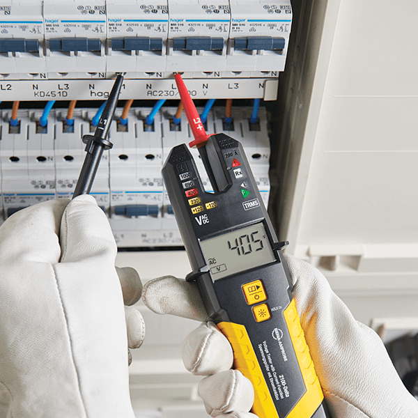 Mit Sicherheitsspezifikationen gemäß den Messkategorien CAT III 1000 V/CAT V 600 V ist der Beha Amprobe Spannungsprüfer 2100-Delta ideal für die Fehlersuche in industriellen und gewerblichen Umgebungen. Sie können mit einem einzigen Gerät Messwerte für Spannung, Stromstärke, Widerstand, Durchgang und Frequenz erfassen. Die Messspitzen können bei der Spannungsprüfung sicher oben am Gehäuse des Geräts befestigt werden, damit Sie eine Hand frei haben. Mit dem 2100 Delta können Sie Strom bis zu 200 A AC einfach ohne Unterbrechung des Stromkreises messen, indem Sie die offene Stromzange über den Leiter schieben. Er ist gemäß Schutzart IP 64 gegen das Eindringen von Spritzwasser und Staub spezifiziert, erfüllt die Anforderungen der Norm EN 61243-3:2014 für Spannungsprüfer und ist GS-geprüft.