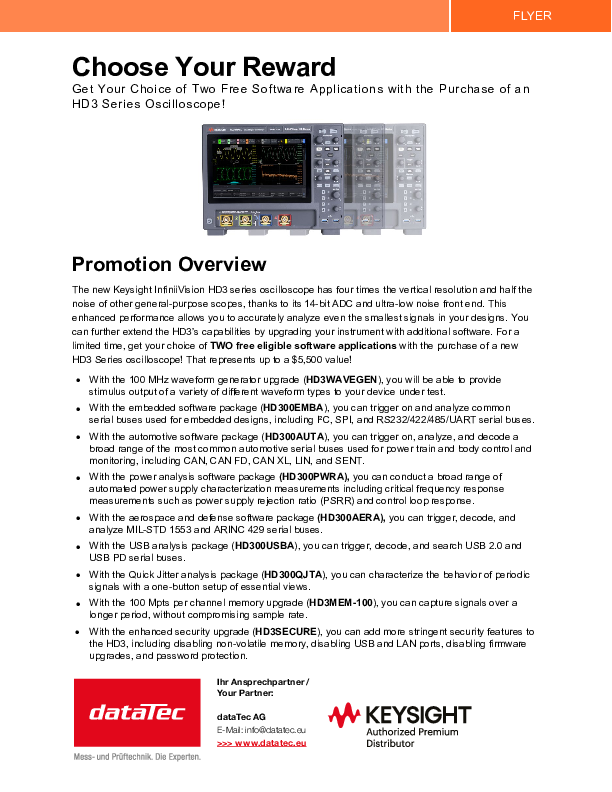 Sichern Sie sich im Rahmen dieser Keysight Aktion zwei gratis Optionen nach Wahl beim Neukauf eines der Keysight HD3 Aktions-Oszilloskope.