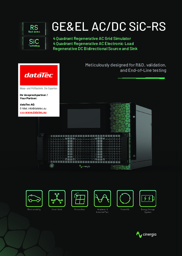 Das GE&EL 22.5 AC/DC SiC-RS gehört zur neuesten Generation der Cinergia Rack-Serie und kombiniert drei vollwertige Leistungsfunktionen in einem einzigen Gerät: AC-Netzsimulator, AC-Elektronische Last sowie bidirektionale DC-Quelle/Senke. Die neue RS-Plattform setzt auf modernste SiC-Leistungselektronik mit deutlich gesteigerter Dynamik, höherer Effizienz und einer nochmals verbesserten Benutzeroberfläche.