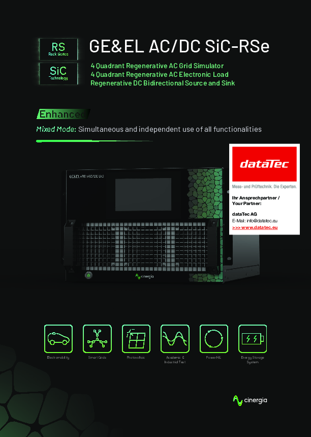 Das GE&EL 30 ist das leistungsstärkere Modell der Cinergia GE&EL AC/DC SiC-RSe Rack-Serie. Es vereint AC-Netzsimulator, AC-Elektronische Last und bidirektionale DC-Quelle/Senke in einem kompakten 7U-System und bietet 30 kVA/kW für anspruchsvolle F&E- und Prüfumgebungen. Das Gerät nutzt modernste SiC-Technologie mit hoher Dynamik, exzellenter Netzqualität und echter Energierückspeisung.