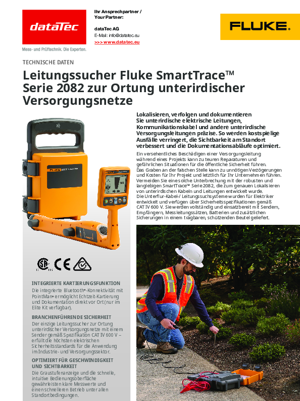 Die Leitungssucher der Fluke SmartTrace Serie 2082 wurden entwickelt, um unterirdische elektrische Leitungen, Kommunikationskabel und andere Versorgungsnetze präzise zu lokalisieren, zu verfolgen und zu dokumentieren. Die Systeme kombinieren robuste Hardware mit intelligenter Signalverarbeitung und ermöglichen eine zuverlässige Ortung sowohl spannungsführender als auch spannungsloser Leitungen. Durch die sichere CAT IV 600 V Spezifikation des Senders erfüllt die Fluke SmartTrace Serie 2082 hohe Sicherheitsanforderungen für Anwendungen im Industrie- und Versorgungssektor. Die Geräte sind vollständig einsatzbereit und werden als Komplettsystem mit Sender, Empfänger, Messleitungen und Zubehör geliefert.