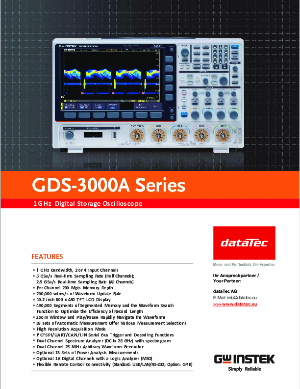 Die GDS-3000A Serie von GW Instek bietet leistungsstarke 1 GHz Digital-Speicheroszilloskope für anspruchsvolle Messaufgaben in Entwicklung, Labor und Service. Dank hoher Abtastraten, großer Speichertiefe und integrierter Analysefunktionen ermöglichen diese Geräte eine präzise Erfassung und komfortable Auswertung schneller Signale – sowohl im Zeit- als auch im Frequenzbereich.