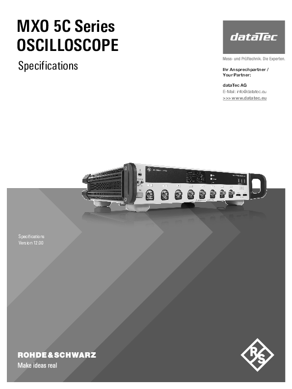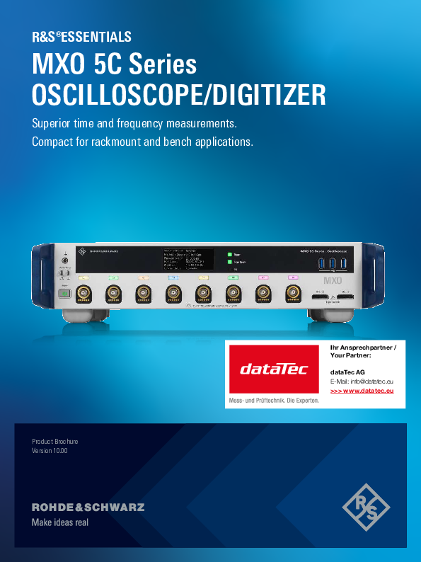 Die kompakten Oszilloskope der Rohde & Schwarz MXO 5 C Serie bieten branchenführende Technologie, die Ihr Verständnis und die Prüfung elektronischer Systeme beschleunigt. Die MXO 5 C Serie ist technisch identisch mit den erfolgreichen und bewährten Rohde & Schwarz MXO5 Oszilloskopen. Durch ihre kompakte Bauweise mit lediglich 2 HE lassen sich die Oszilloskope der MXO5C Serie hervorragend in Racks einbauen oder aufeinander stapeln. Die MXO5C Serie umfasst sowohl 4- als auch 8-Kanal Modelle mit Bandbreiten von bis zu 2 GHz, einer maximalen Samplingrate von bis zu 5 GSa/s, eine Erfassungsrate von bis zu 4,5 Mwfm/s sowie eine vertikale Auflösung von 12 bit ADC (18 bit im HD Modus).