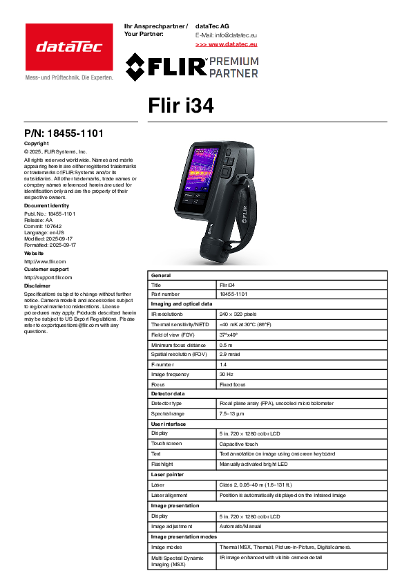 - Bild/Medien: Radiometrische JPEGs; Modi MSX, Thermal, PiP, Digitalkamera; 8 MP-Sichtkamera (AF), Textannotation