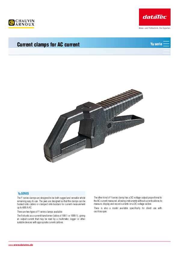These clamps are especially suitable for weak to medium AC currents up to 600 A. With the hook-shaped jaw, individual cables or small busbars can be gripped particularly well. The clamps Y4 has a current output for multimeters, recorders, etc. with AC current measurement input.