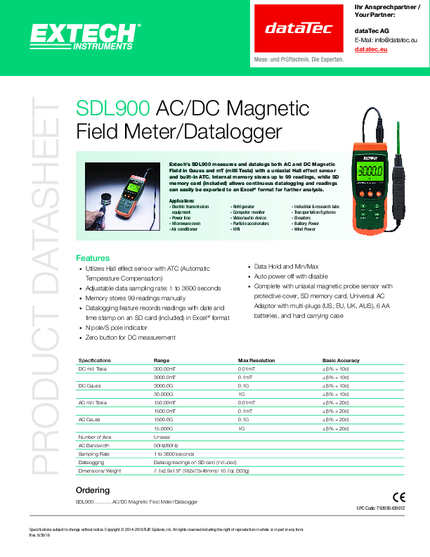 The Extech SDL900 is an AC/DC magnetic field meter and data logger with automatic temperature compensation. The SDL900 uses a Hall effect sensor. This meter has an adjustable data sampling rate from 1 to 3600 seconds.