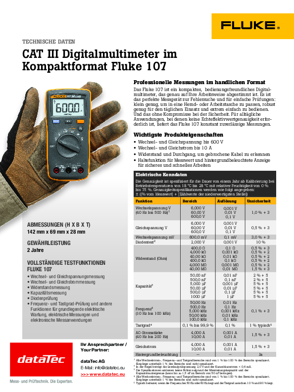 The Fluke 107 was specially developed for users who need an easy-to-use pocket-sized multimeter. The large rotary switch allows quick access to all measurement functions, while a hold button freezes measured values for convenient reading or documentation. The CAT III 600 V safety specification enables measurements in typical distribution boards and sub-distribution boards without compromising safety.