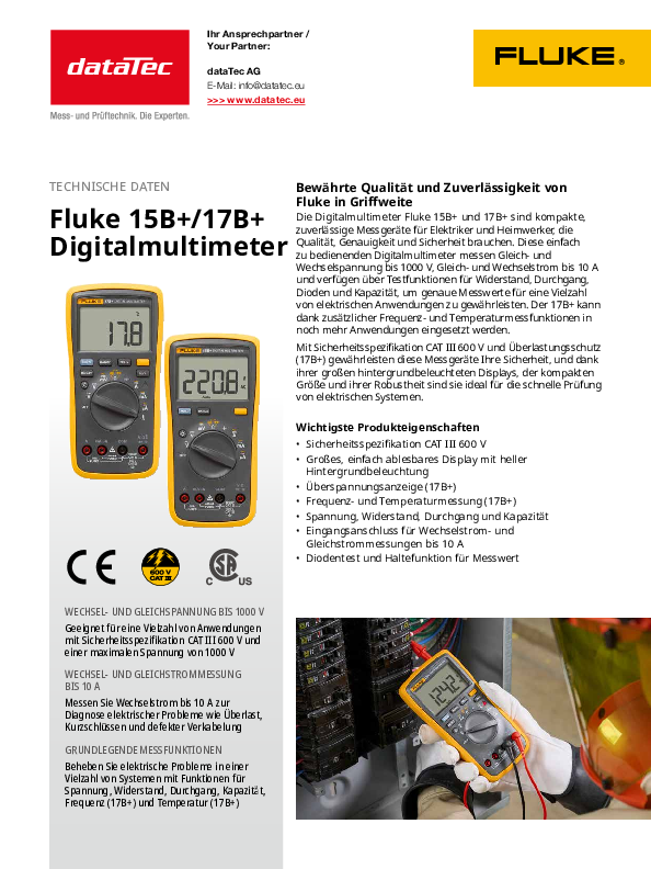 The model 15B+ presented here and its sister model 17B+ belong to the same product family. Both offer voltage and current measurements up to 1,000 V and 10 A respectively, a backlit display and basic electrical measurement functions.