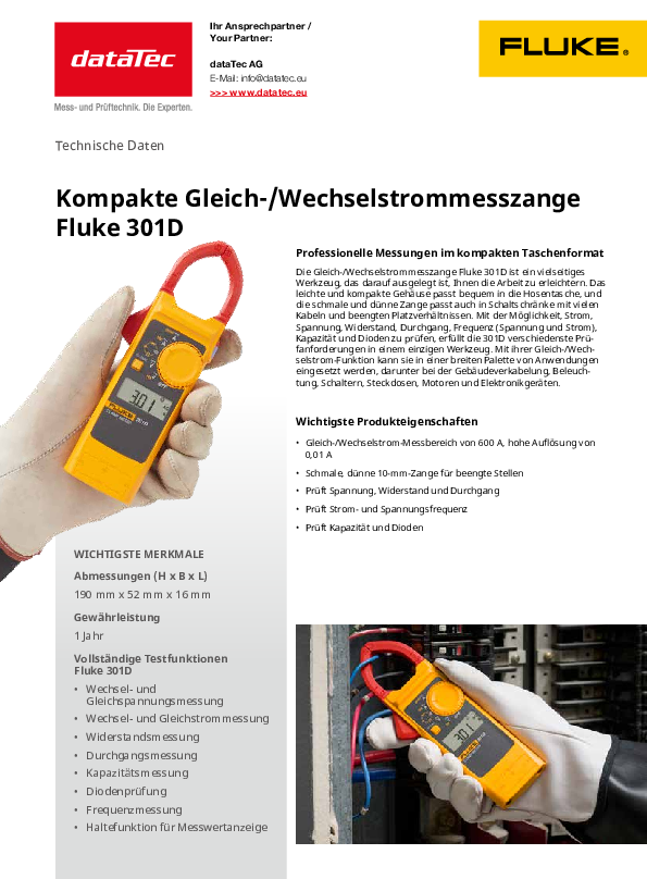 The compact Fluke 301D DC/AC clamp meter is a handy measuring tool for electricians, service technicians and ambitious users who need reliable measurements in confined spaces. Thanks to the slim housing with a depth of just 16 mm and a weight of only 154 g, the device can be carried comfortably in a trouser pocket or tool bag.