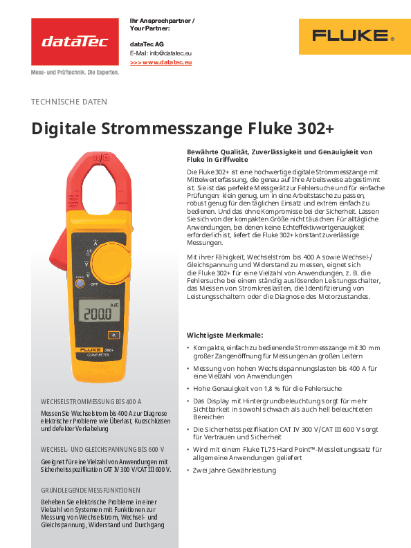 The Fluke 302+ is specially designed for electricians, service technicians and maintenance engineers who need a handy measuring device for routine tests. It covers typical tasks in residential and commercial buildings as well as work on switch cabinets, smaller machines and distribution boards.
