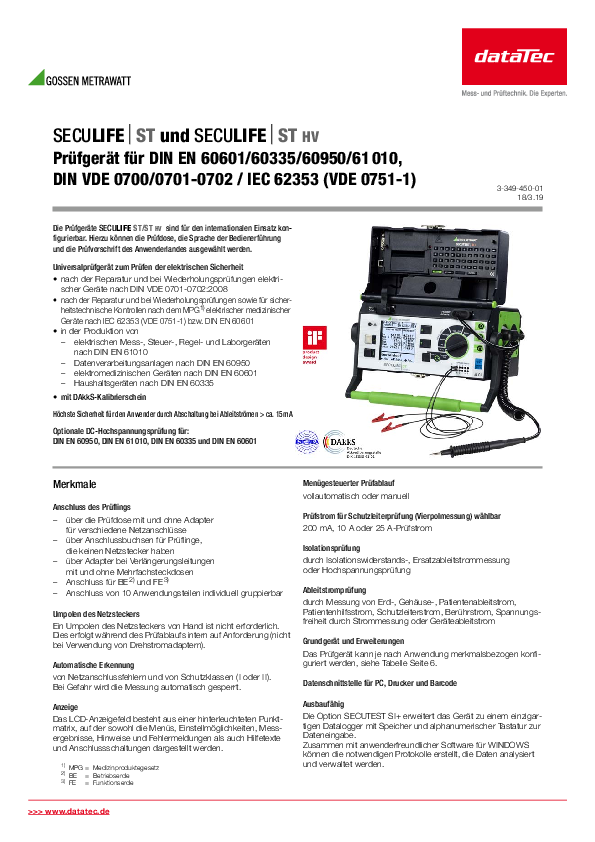 Multifunctional testing device for medical devices. As a multifunctional test device, the SECULIFE ST is ideally suited for carrying out and documenting measurements on medical devices. It enables precise testing of mobile medical devices. As a manufacturer, you can test your devices according to the applicable standard.