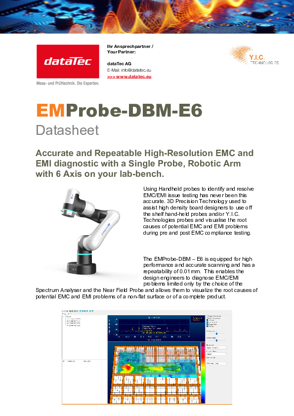 The Y.I.C. EMProbe-DBM-E6 is a computer-controlled EMC/EMI diagnostic system with a 6-axis robotic arm that makes near-field measurements significantly more precise and repeatable than conventional manual measurements. With a repeatability of 0.01 mm, it enables high-resolution spatial scans and reliable reproducibility of results - ideal for revealing the causes of interference emissions and directly comparing design iterations.