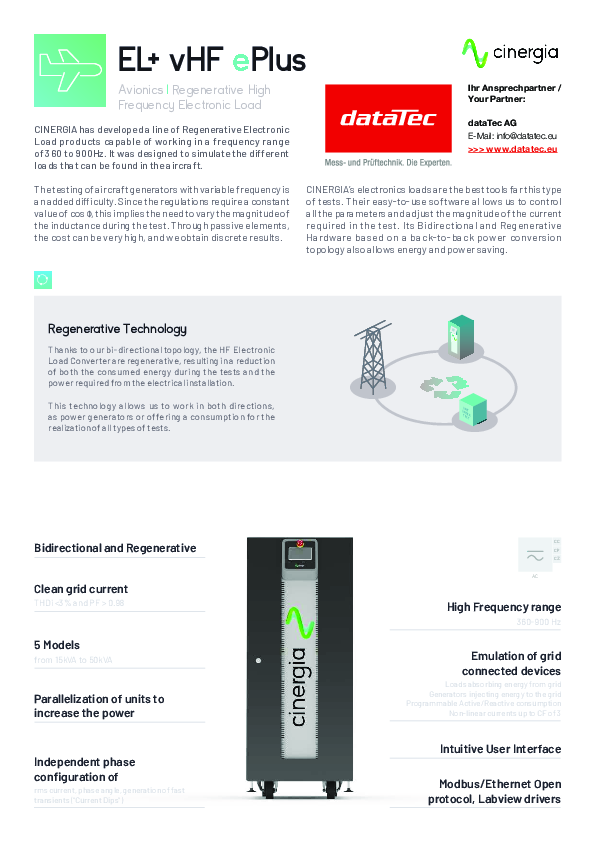Die EL+ vHF Serie wurde speziell für Avionik-Anwendungen entwickelt und bildet eine rückspeisefähige, bidirektionale Lastplattform für Hochfrequenz-Netze von 360–900 Hz. Sie simuliert lineare und nichtlineare Verbraucher sowie netzgekoppelte Geräte realitätsnah und ermöglicht Prüfungen mit hoher Präzision bei gleichzeitig minimalem Energiebedarf dank regenerativer Rückspeisung.