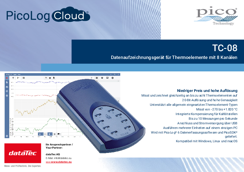 Mit 8 direkten Thermoelementen-Eingängen kann der TC-08 schnelle und präzise Messungen durchführen. Darüber hinaus können auf einem PC bis zu 20 Einheiten simultan verwendet werden. Der Datenlogger kann durch Verwendung eines entsprechenden Thermoelementen-Typs (B, E, J, K, N, R, S, T) den Temperaturbereich von -270° C bis +1.820° C messen und aufzeichnen.