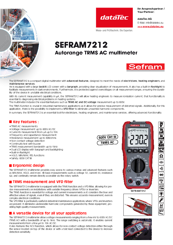 SEFRAM 7212 | TRMS AC-Multimeter 600 V, 10 A, 6.000 Counts, Auto‑Range