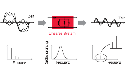 Bei linearen Geräten werden die Eingangssignale im Betrag (Amplitude) oder in der Phase verändert. Die Eingangs- und Ausgangsfrequenzen sind identisch; es werden keine zusätzlichen Frequenzen oder neuen Signale erzeugt. Für eine lineare, verzerrungsfreie Signalübertragung muss der Amplitudengang des Prüflings (engl. DUT, device under test) flach und der Phasengang über die gewünschte Bandbreite linear sein.