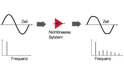 Beispiel für nichtlinear induzierte Verzerrung: Wird ein Verstärker eingangsseitig ausgesteuert, übersteuert das Ausgangssignal, weil der Verstärker gesättigt ist. Das Ausgangssignal ist keine reine Sinuskurve mehr. Es treten Oberwellen auf, die ein Vielfaches der Eingangsfrequenz betragen. Passive Systeme können bei hohen Leistungspegeln ebenfalls ein nichtlineares Verhalten aufweisen, z. B. ein LC-Filter, das Induktoren mit Magnetkern verwendet. Magnetische Materialien weisen oft Hysterese-Effekte auf, die nichtlinear sind.