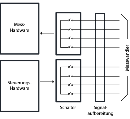 Die Schaltnetzwerke des DAQ sind entweder integriert oder als separate Module einsetzbar. Hierüber können beispielsweise die Messwerte von Sensoren nacheinander oder auch synchron erfasst werden. Die Schaltblöcke fungieren auch als Stimuli eines DUT, indem z. B. unterschiedliche Temperaturwerte bereitgestellt werden können.