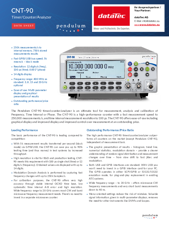 The powerful CNT-90 frequency counter from Pendulum Instruments is characterized by its high measuring speed and resolution. It is used as a high-performance analyzer for the high-precision measurement and calibration of frequencies, time intervals or phases. Its speed enables up to 250,000 measurements per second. The measurement resolution for the time domain measurement is up to 100 ps. The CNT-90 displays frequency measurements with 12 digits.