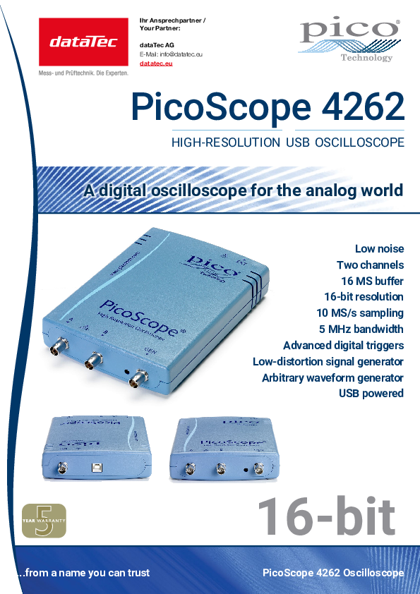 The PicoScope 4262 PC oscilloscope offers you the following advantages: You can take the device with you and connect it to any Windows PC and use the device as an oscilloscope, spectrum analyzer, function generator or interface for data acquisition at high speed.