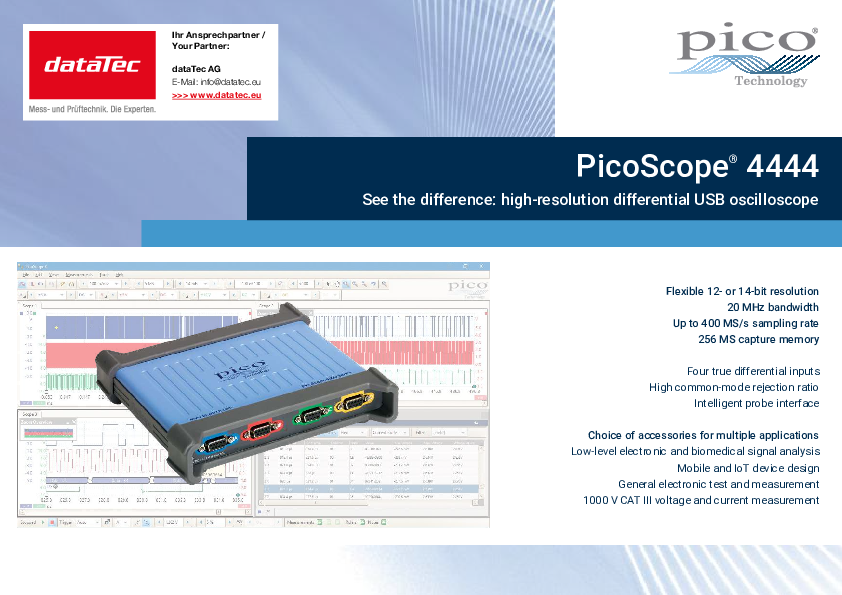 The PicoScope 4444 USB oscilloscope has four differential input channels with the correct signal and a range of optional accessories for measurements from millivolt to 1000 V CAT III applications.