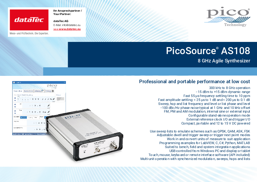Particularly small, particularly powerful: The reasonably priced PicoSource function generator AS108 is characterized by its flexible and efficient application options - with a wide frequency range from 300 kHz to 8 GHz, with a fast settling behavior, with extensive setting options and functions and with an ultra-compact design.