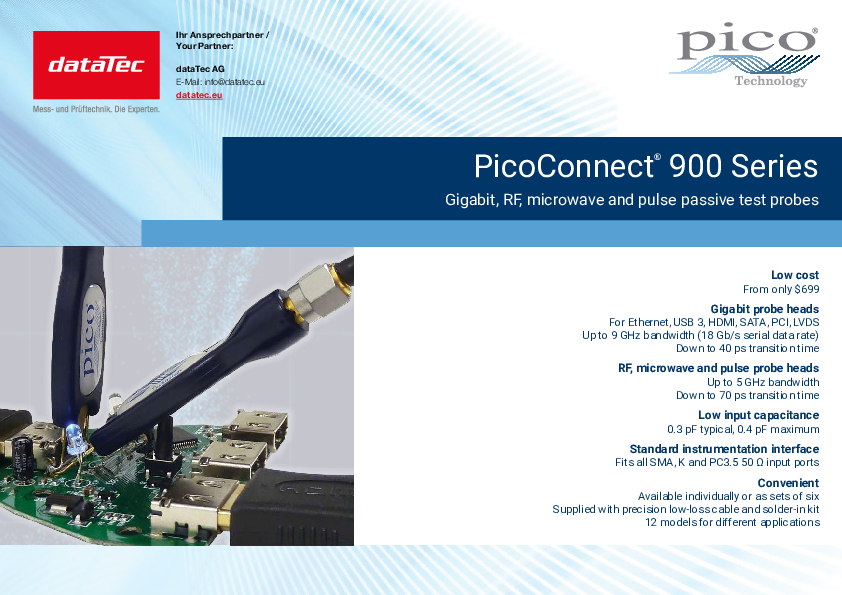 The PicoConnect 900 Series low-invasive, high-frequency passive probes are designed for microwave and gigabit applications. They deliver unprecedented performance and flexibility at a low price. The probes employ a unique (patent pending) in-PCB construction to realize extremely low capacitance, coplanar microwave integrity, robust reliability and very low cost. The result is a family of miniature interchangeable passive probe heads that cover a range of division ratios, bandwidths and coupling types.