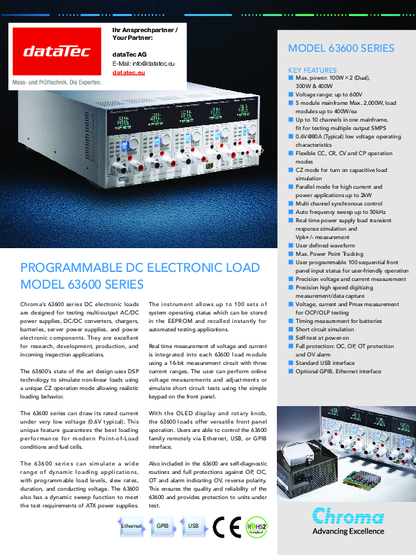 Les charges sont conçues pour tester les blocs d'alimentation, les convertisseurs DC/DC, les chargeurs, les batteries, les adaptateurs et les composants électroniques haute performance. Elles conviennent parfaitement à la recherche, au développement, à la production et aux tests de réception. Ils utilisent la technologie DSP pour simuler des charges non linéaires avec un mode de fonctionnement CZ (Constant Impedance), ce qui permet de représenter un comportement de charge réaliste.