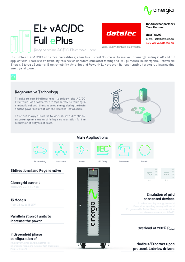 La série CINERGIA EL+ vAC/DC ePlus est une charge électronique régénérative bidirectionnelle de pointe pour les tests AC/DC dans les laboratoires, les instituts de recherche et les environnements de test industriels. Cette série est considérée comme l'une des sources d'énergie régénératives les plus polyvalentes du marché, combinant haute précision, efficacité énergétique et contrôle flexible dans un appareil compact. Grâce à sa technologie de récupération d'énergie, elle réduit considérablement la consommation d'énergie et permet des procédures de test durables et rentables. Grâce à une entrée réseau harmonique avec un THDi inférieur à 3 % et un facteur de puissance supérieur à 0,98, elle répond aux exigences les plus élevées en matière de qualité du réseau et de technique de test.
