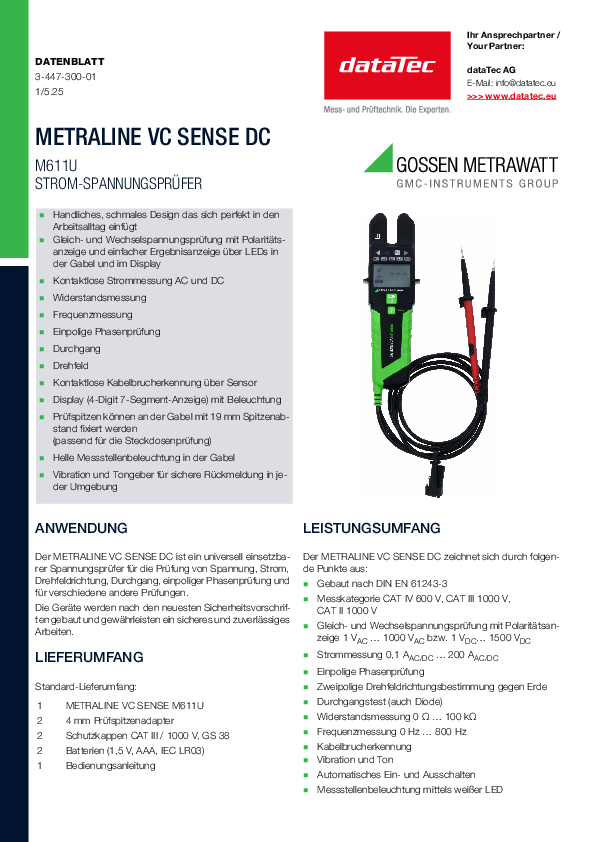 Le METRALINE VC SENSE DC de Gossen Metrawatt est un professionnel du test universel pour l'artisanat électrique, la maintenance et l'industrie. Il combine le contrôle de tension bipolaire (AC/DC) avec affichage de la polarité, la mesure de courant AC/DC sans contact, le test de continuité/diode, la mesure de résistance et de fréquence ainsi que la détermination du champ tournant - le tout complété par un éclairage clair du point de mesure, un retour d'information acoustique/haptique et une fonction marche/arrêt automatique. Sa forme étroite, sa protection IP64 et sa catégorie de mesure CAT IV 600 V/CAT III 1000 V garantissent des utilisations robustes et sûres directement sur les installations et les distributions.