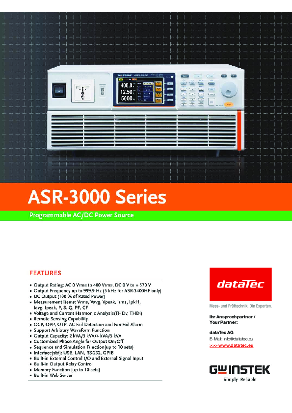 Les alimentations AC/DC de la série ASR-3000 se distinguent par leur montée et leur descente rapides de la tension DC (≤ 100 µs). La série se compose de quatre modèles : ASR-3200 (2000 VA), ASR-3300 (3000 VA), ASR-3400 (4000 VA) ainsi que ASR-3400HF (4000 VA, 5 kHz). Tous les modèles fournissent 100 % de leur puissance nominale. Ils sont utilisés entre autres pour le développement de composants et d'appareils électroniques tels que les chargeurs embarqués, les unités d'alimentation pour serveurs, les modules LED, les entraînements AC, les ventilateurs AC ou les ASI et conviennent en outre pour les applications de test dans le domaine de l'automobile et des appareils ménagers.