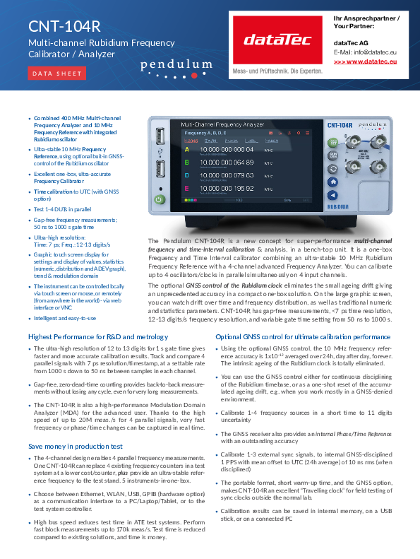 Le Pendulum CNT-104R est un calibreur/analyseur de fréquence au rubidium multi-canal dans un appareil de table compact. Cet appareil tout-en-un combine une référence de fréquence au rubidium ultra-stable de 10 MHz avec un analyseur de fréquence avancé à 4 canaux. Il permet d'étalonner simultanément jusqu'à quatre oscillateurs/horloges sur les quatre canaux d'entrée.