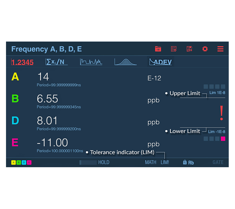 Le contrôle GNSS optionnel de la base de temps en rubidium élimine les dérives de vieillissement minimales et offre une précision sans précédent dans une solution compacte. Le grand écran graphique permet d'observer la dérive au fil du temps ainsi que la distribution des fréquences, complétée par des paramètres numériques et statistiques traditionnels. Le CNT-104R offre des mesures sans faille, une résolution temporelle de <7 ps, une résolution fréquentielle de 12-13 chiffres par seconde et un réglage variable du temps de porte de 50 ns à 1000 s.