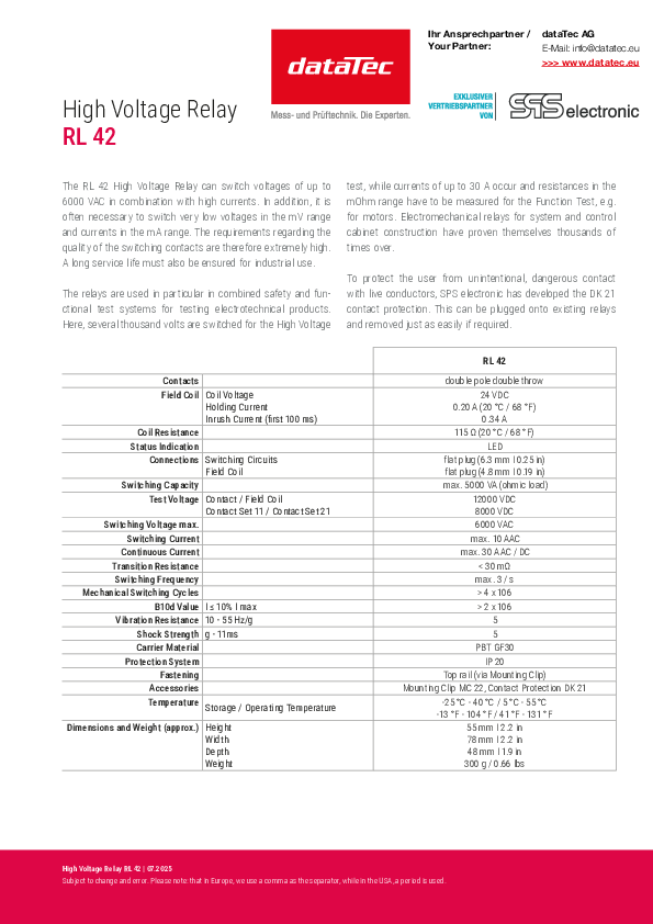 .Relais haute tension 6.000 V / max. 30 A nombre de pôles 2, bobine 24 VDC / 0,25 A.