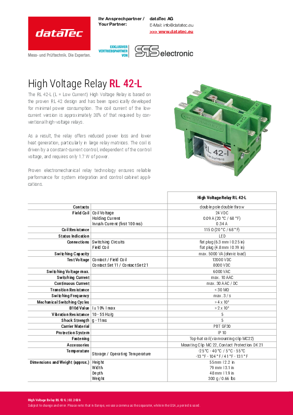 Le relais haute tension RL 42-L (L = Low Current) a été développé sur la base du RL 42 qui a fait ses preuves depuis de nombreuses années. Lors du développement, une importance particulière a été accordée à une consommation de courant aussi faible que possible. La consommation de courant pour l'utilisation de la variante Low Current est d'environ 30% par rapport aux relais HT traditionnels. Cela peut être garanti par une puissance de commande plus faible pour les mêmes paramètres de commutation. D'autres avantages qui en résultent sont une puissance dissipée plus faible et moins de chaleur pour les grandes matrices de relais. La commande de la bobine fonctionne avec un courant constant - indépendamment de la tension de commande. Le relais haute tension RL 42-L ne nécessite que 1,7 watt.