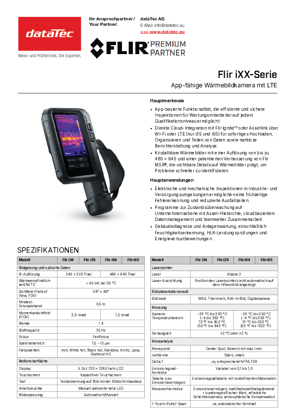 La FLIR i65 est le modèle haut de gamme de la série : haute résolution IR, plage de température étendue et connectivité LTE pour les applications les plus exigeantes dans l'industrie, la technique énergétique et la gestion des installations.