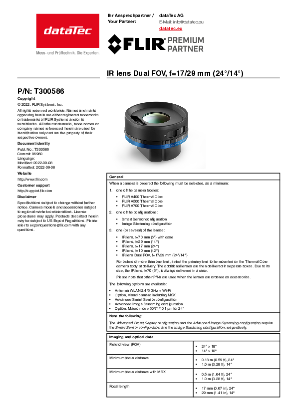 Le double objectif Flir de Teledyne offre un zoom optique radiométrique 1,7x qui permet de passer aisément de l'objectif standard au téléobjectif. Avec un seul objectif, vous obtenez des images thermiques et visuelles pour différentes applications. Plus de temps d'arrêt ni de changement d'objectif fastidieux ! Le nouvel objectif DUAL-FOV est compatible avec les caméras thermiques de la série Exx/T5xx/8xx ainsi que de la série Axxx.