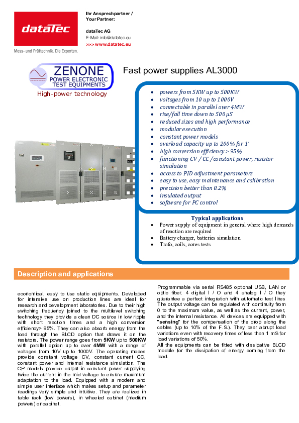 La série AL3000 est modulaire et couvre une très large gamme de puissance et de tension. Selon les exigences, des appareils de table compacts, des armoires mobiles sur roulettes ou des solutions d'armoires puissantes sont disponibles.