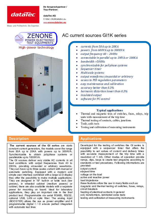 Les sources de courant AC de la série GI2K sont des générateurs statiques de courant constant pour des courants alternatifs très stables sur une large plage de charge. Selon le modèle, la série couvre des courants de sortie de 50 A à 20 kA et des puissances de 600 VA à 300 kVA. Les appareils fonctionnent avec une fréquence de sortie réglable de 40 à 200 Hz et prennent en charge les formes de sortie sinusoïdales et librement définissables (arbitraires). Pour les puissances d'essai plus importantes, les systèmes peuvent être synchronisés (pour les applications polyphasées) ou montés en parallèle (jusqu'à 1 MVA ou 100 kA).
