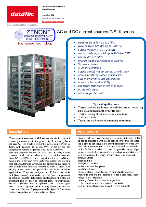 La série GIS2K de Zenone Elettronica comprend des sources de courant constant statiques et puissantes pour la génération de courants AC et DC très stables. Les systèmes sont conçus pour des tâches de contrôle, de test et d'étalonnage exigeantes et couvrent une très large gamme de courant et de puissance. Grâce à une électronique de puissance moderne, une précision élevée et des possibilités de programmation étendues, les appareils conviennent aussi bien à une utilisation en laboratoire qu'à des installations de test automatisées et des lignes de production.