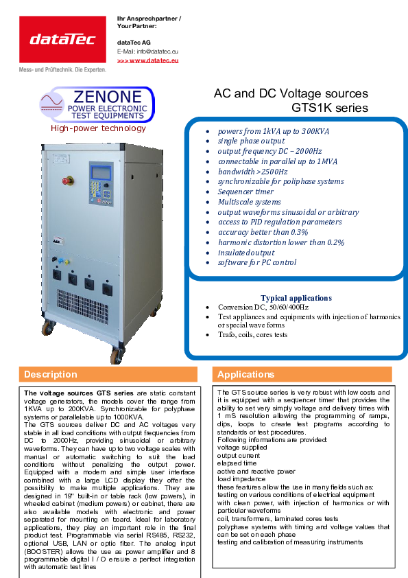 La série GTS2K de Zenone Elettronica comprend des sources de tension constante AC et DC hautement dynamiques pour des applications de contrôle et de test exigeantes. Les appareils fournissent des tensions continues et alternatives extrêmement stables sur une très large plage de fréquences allant jusqu'à 2000 Hz et permettent non seulement des courbes de tension sinusoïdales mais aussi librement programmables. Grâce à une bande passante élevée, une excellente précision et des fonctions de commande étendues, la série est idéale pour les applications de laboratoire, le développement, l'assurance qualité ainsi que les systèmes de test automatisés.