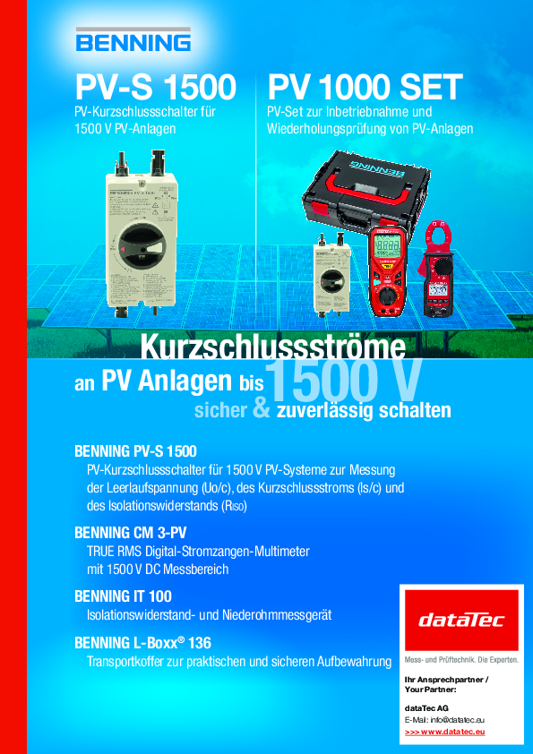Ideal for installers, service technicians and experts, the set enables complete testing of all safety-relevant PV parameters: open-circuit voltage, short-circuit current, insulation resistance and protective conductor resistance. Thanks to the high-quality devices - including the BENNING PV-S 1500 short-circuit switch, the BENNING CM 3-PV current clamp multimeter and the BENNING IT 100 insulation and resistance measuring device - PV strings can be evaluated quickly, safely and reliably.