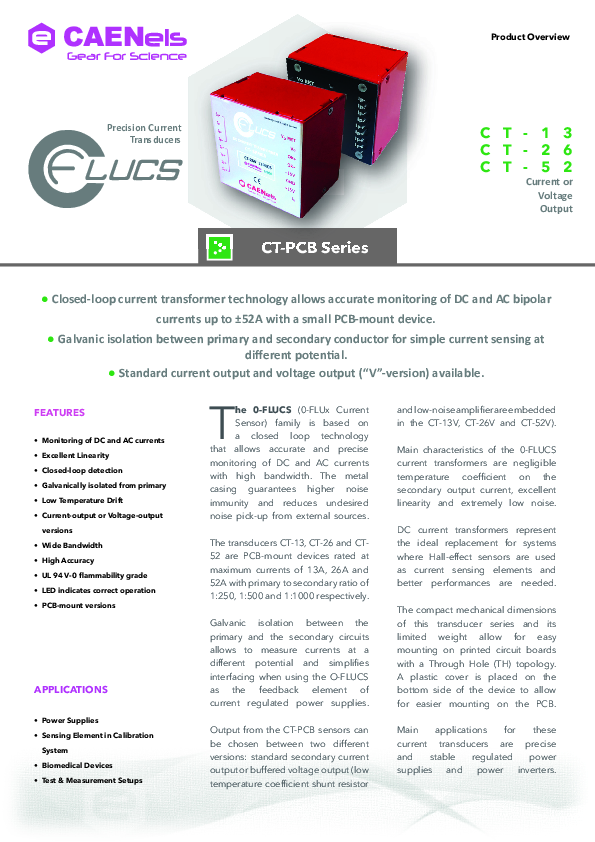 0-FLUCS Current Transmitter / Current Converter for PCB assembly with closed-loop technology for high-precision measurement of bipolar AC and DC currents. For monitoring and measuring DC and AC currents (up to 500 kHz bandwidth) with excellent linearity and extremely low temperature drift of 0.5 ppm / K. This fully encapsulated version prevents radiation as well as radiation from neighboring assemblies and thereby improves noise immunity. The primary and secondary side are electrically isolated. The current transformer can therefore be used at different potential levels for exact current measurement.