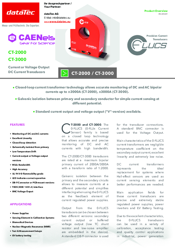 Der CT-2000 ist ein hochpräziser Stromwandler zur Messung von Gleich- und Wechselströmen bis ±2000 Ampere und eignet sich hervorragend für anspruchsvolle industrielle Anwendungen, Labormessungen sowie Test- und Prüfumgebungen. Dank seiner Closed-Loop-Technologie gewährleistet der CT-2000 eine äußerst genaue, rauscharme und stabile Stromerfassung über den gesamten Messbereich hinweg. Die galvanische Trennung zwischen Primär- und Sekundärkreis ermöglicht eine sichere Messung auch bei unterschiedlichen elektrischen Potenzialen und vereinfacht die Integration in bestehende Systeme. Mit einem Übersetzungsverhältnis von 1:2000, einer typischen Bandbreite von 100 kHz, einer sehr hohen Linearität und einer Temperaturdrift von unter 0,5 ppm/K bietet der CT-2000 exzellente Messeigenschaften für eine Vielzahl von Anwendungen. Der Stromausgang erfolgt über einen DB-9-Anschluss, und eine Status-LED signalisiert jederzeit den ordnungsgemäßen Betrieb. Das Gerät ist in einem robusten, flammhemmenden Gehäuse untergebracht, verfügt über eine großzügige Leiterdurchführung mit einem Durchmesser von 67 mm und ist für eine Versorgungsspannung von +24 V ausgelegt. Der CT-2000 ist die ideale Wahl für alle, die höchste Zuverlässigkeit und Präzision bei der Strommessung im Hochstrombereich benötigen.