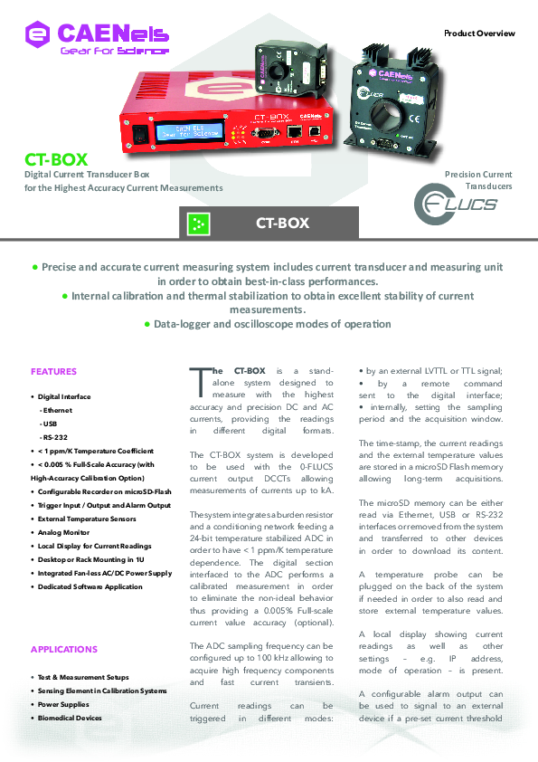 The CT-BOX is a measuring system for the measurement of direct and alternating currents with high accuracy and precision, whereby the measured values are made available in various digital formats. The CT-BOX system was developed for use with CARNels current transformers, which enable measurements of currents up to kA.