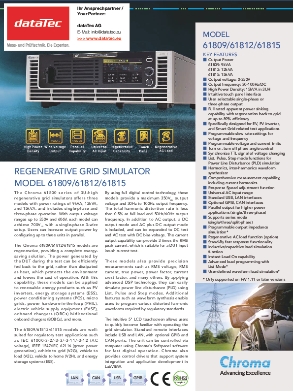 The Chroma 61809/61812/61815 models are available with an optional regenerative AC load function (B618007). This option allows a single device to act as either an AC load or an AC source. This feature is intended for, but not limited to, EVSE charging stations, hybrid PV inverters, UPS and bi-directional on-board chargers (BOBC).