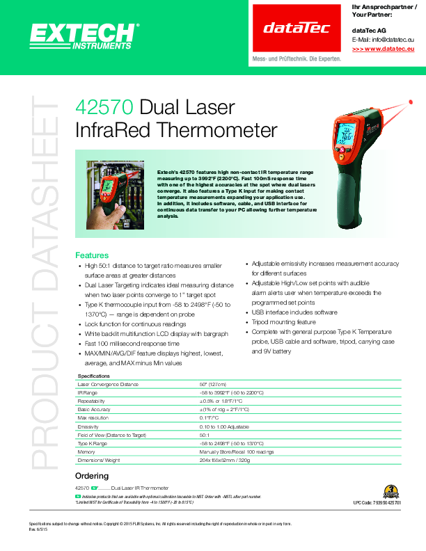 The Extech 42570 dual laser infrared thermometer measures temperatures from -50 to 2200 °C (-58 to 3992 °F) and has a fast response time of 100 milliseconds. The device also has a type K input and a USB interface. The adjustable high/low preset points with audible alarm inform you when the programmed temperature thresholds are exceeded. It comes complete with USB cable, software, carrying case and 9 V battery.