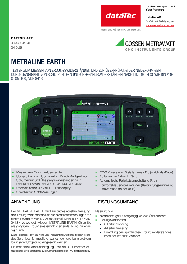 The Metraline Earth M590R is your reliable partner for precise earthing measurements and low-resistance measurements with a test current of ≥ 200 mA in accordance with EN 61557-4 / VDE 0413-4. With this device, you can carry out all common earthing measurement methods effortlessly and reliably. Particularly noteworthy is the professional earthing analysis according to Wenner and the precise measurement method for checking earthing and lightning protection systems using 3- and 4-wire circuits. Its compact design enables use in various environments and is ideal for mobile applications.
