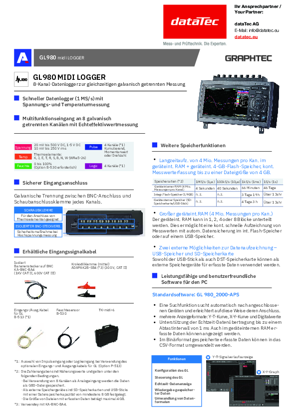 GL980-EU with 8 analog measuring channels for voltage (from 20 mV to 500 V), temperature (thermocouples) and air humidity (e.g. B-530) incl. calibration certificate, power supply, German menu navigation, German quick guide, USB cable, screen protector, screwdriver. In a complete set including 2x battery B-569, case TK-midi-6, 8x KA-BNC-BA4-1.6m, ADAPAK2B-SB4 and 16 GB USB stick.