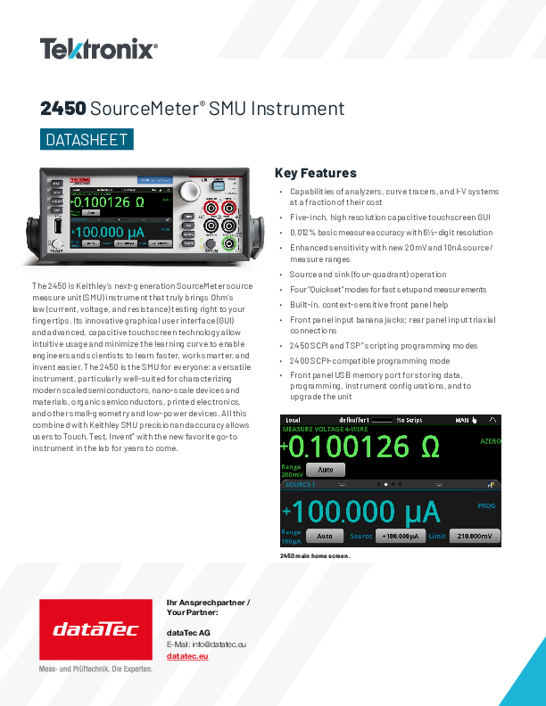 The SourceMeter 2450 offers an innovative graphical user interface (GUI) with capacitive touchscreen technology and thus enables intuitive application for I/V characterization for a variety of modern electronic components and materials, e.g. nanomaterials (graphenes, carbon nanotubes, etc.), semiconductor structures, printed electronics, LEDs, diodes, sensors, BJTs, FETs, solar cells or even batteries (evaluation of charge/discharge cycles, etc.). The SMU 2450 combines the functions of a 4-quadrant current/voltage source and load with those of a precise current and voltage measurement and a 6½ -digit digital multimeter (DMM). You can also control the trigger execution of your measuring instrument: The so-called TriggerFlow provides you with four command blocks with which you can configure both simple and complex trigger scenarios with up to 255 decision levels.